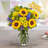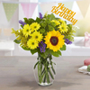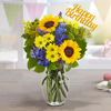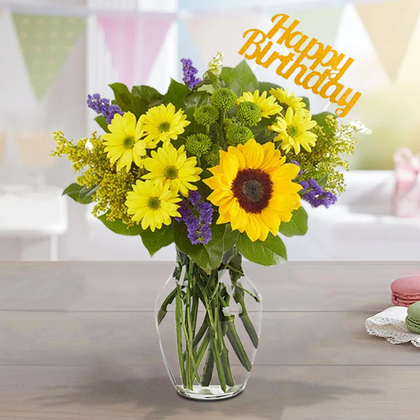With cheerful yellow sunflowers, lush greenery, and pops of bright blue, this bouquet is a delightful way to add some birthday cheer to your loved one's special day. Complete with a "happy birthday" sign, it's sure to make their celebration even more memorable.