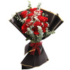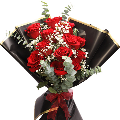A gesture of love, deep as the crimson bloom itself. This luxurious bouquet gathers a dozen velvety red roses, each petal a whisper of devotion, surrounded by delicate baby’s breath and soft eucalyptus greenery. Wrapped in sleek black with golden edges, it’s a statement of passion dressed in elegance. Whether for a grand romantic gesture or an unforgettable anniversary, this bouquet speaks volumes. A timeless emblem of love that lingers long after the flowers have bloomed.