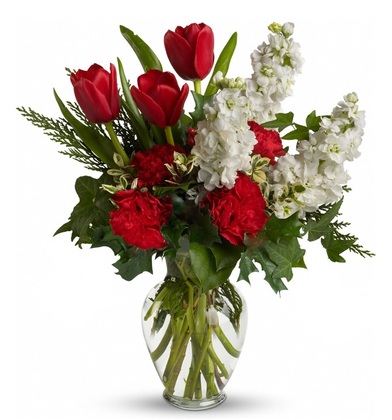 Everyone will gather 'round this festive flower arrangement, making this holiday season extra special. This beautiful arrangement features vibrant tulips imported all the way from Holland, making it a perfect treat for all the tulip enthusiasts out there. Adorned with winter greenery, this flower arrangement adds a touch of festive spirit to any space, creating a warm and inviting atmosphere. It is guaranteed to bring joy and cheer to any recipient, making it an ideal Christmas or holiday gift. With our same-day delivery service in Toronto, you can easily surprise your loved ones with this delightful present. Our fresh flowers are carefully selected to ensure their longevity, so you can be confident that your gift will maintain its beauty throughout the holiday season. Whether you're searching for the perfect Christmas gift, a centerpiece for your holiday table, or simply want to brighten someone's day, our Holiday Gathering Flower Arrangement is the ideal choice. Place your order now and let the festive flowers spread happiness and love this holiday season.