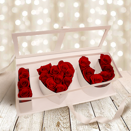 Bold, passionate, and beautifully expressive. This luxurious flower box lets your love shine through with unmistakable charm. Radiant red roses are artfully arranged to spell “I ♥ U,” turning a classic message into an unforgettable floral masterpiece. Presented in an elegant box with a clear lid, it’s a striking gift for Valentine's Day, anniversaries, proposals, or any moment meant to celebrate love in the grandest way.