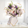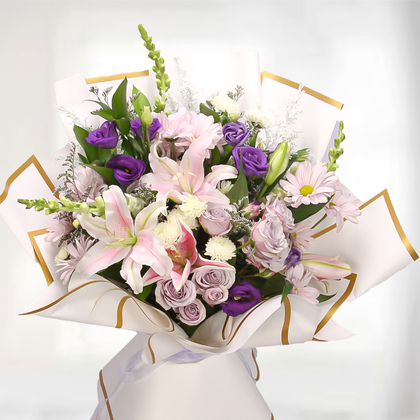 A breathtaking symphony of soft pink lilies, lavender spray roses, cheerful daisies, and rich purple blooms, this luxury bouquet is designed to dazzle. Accented with lush greenery and wrapped in white with golden trim, it radiates both elegance and joy. Perfect for celebrating life’s most cherished moments, this arrangement blends romance with sophistication, making it a heartfelt gift that will brighten their day and leave a lasting impression of beauty and thoughtfulness.