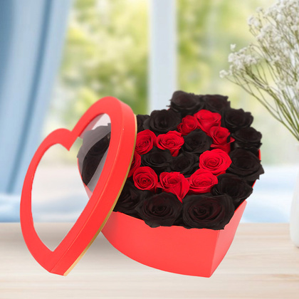 Turn up the drama and let your love shine in the most unforgettable way. This heart-shaped box overflows with a striking mix of velvety red roses and bold black roses, creating a show-stopping arrangement that makes a statement before the lid even comes off. Big, breathtaking, and full of passion, it’s designed to impress at first sight and linger in memory long after. This is love, turned all the way up.