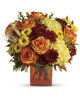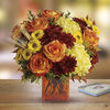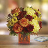 Bring a bright contemporary touch to this glorious season with a chic fall bouquet in a stylish orange cube vase. Subtly sensational, it's a great gift for faraway friends. Makes a great Thanksgiving centerpiece as well. We offer same day delivery with this beautiful arrangement and we also deliver worldwide.