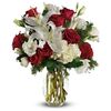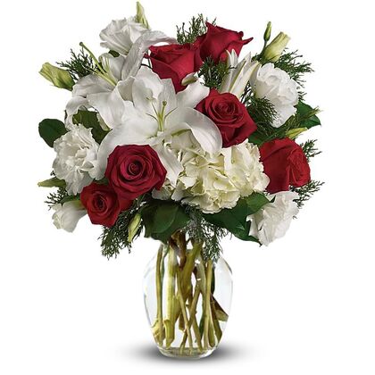 A stunning red and white festive flower arrangement. Velvety red roses, snow white hydrangea, winter white lily's, carnations and winter greens are tastefully arranged in vase. A great way to express your most sincere Merry Christmas wish to a favorite friend, or you may send this to a family member or coworker to wish them a Happy Holiday. We offer same day delivery with this arrangement and we also deliver worldwide.