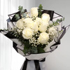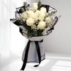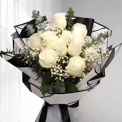 Elegant in every detail, this bouquet of white roses is wrapped in sleek black and soft silver, creating a striking contrast that highlights their quiet beauty. A symbol of purity, respect, and heartfelt intentions, each petal speaks softly of love and new beginnings. Refined and serene, this arrangement is a gift for moments that call for beauty, sincerity, and a timeless expression of care. A gesture that lingers, long after the flowers bloom.
