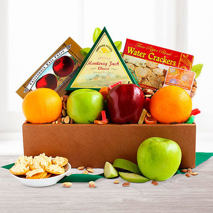 Everyone should have the chance to enjoy the fabulous tastes and flavors of fresh fruit! This classic gift box holds farm fresh fruits and delicious sweet and savory gourmet snacks. Five crunchy apples and juicy oranges are ready to eat, along with creamy cheese, three pepper water crackers, Central valley seasoned almonds and California rail fruit candy.