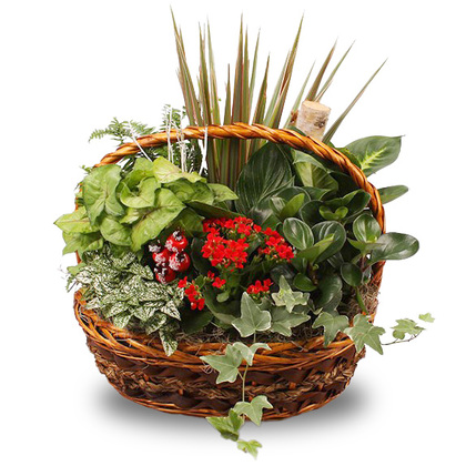 This dish garden planter basket contains blooming plants such as the kalanchoe plant or cyclamen plant, along with assorted tropical plants. Please note that the selection of plants and their colors may vary depending on the time of year. It may include a variety of plants, such as the Polka Dot Plant, Peace Lily plant, Croton plant, Ivy plant, Dieffenbachia Camille plant, Dracaena Compacta plant, Pothos Variegated plant, Hypoestes Polka Dot plant, Palm plant, Spathiphyllum plant, and Syngonium Butterfly plant.